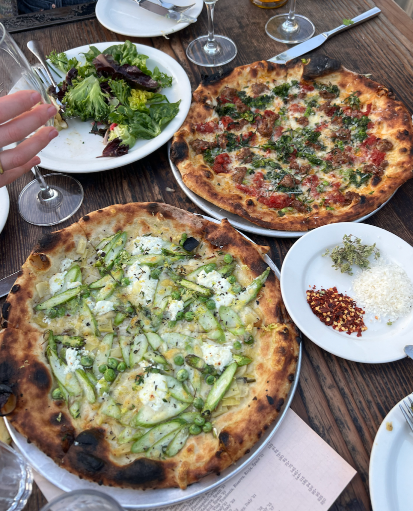 Must Try: Kampachi Crudo, Butterball Potato, Grilled Broccolini, Mixed Market Greens Salad, Squash Blossom Pizza, Housemade Chorizo Pizza, Four Onion Pizza, Wood Roasted Prawn